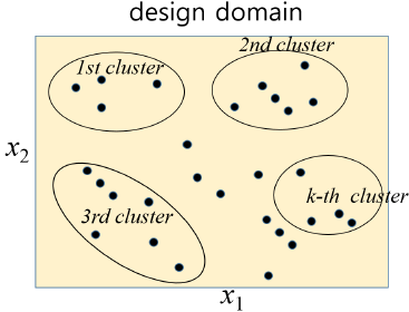 [Fig. 1] k-means clustering ^ 여기서 y − i 는 m개의 표본점중 i 번째 설계점을 제외하 고 생성된 메타모델을 의미한다. 따라서 n t =m이 된다. 메 타모델의 정확한 평가를 위해서는 표본점이 아닌 새로운 설계점 n t 를 시험점으로 하여 생성된 메타모델의 평균제 곱오차(mean square error)를 구하는 것이다. 그러나 이 경우 새로운 설계점에 대한 구조해석을 필요로 하고 이 것은 메타모델을 사용하는 취지에 역행하는 것이다. 반면에 식 (10)을 이용하게 되면 추가적인 설계점이 필요 없어 기존의 표본점을 갖고 메타모델을 평가 할 수 있다. 그러나 이 역시 표본점 수 m개 만큼 메타모델을 생 성해야 하므로 매우 번거로운 과정을 유발한다. 이의 단 점을 극복하기 위해 k-평균 클러스터(k-means cluster) 의 개념을 도입한다. 이 개념을 Fig. 1에 표시하였다. 본 연구에서는 Forgy의 알고리듬을 이용하였다. k-평균 클 러스터를 이용하면 메타모델의 생성횟수를 m개에서 k개 로 줄일 수 있다. 따라서 식 (10)의 CV 검증지수는 다음 과 같이 변형된다. k GMSE = ∑ CV k i = 1 where CV k = n 1 k ∑ i n = k 1 ( y i − y ^ _ k ) 2 (11) 여기서 n k 는 k번째 클러스터에 포함된 표본점의 개수, ^ y _ k 는 k번째 클러스터에 포함된 표본점을 제외한 표본 점 (m-n k )개를 갖고 생성된 메타모델이다. 식 (11)을 이 용하면 표본점 이외의 추가 설계점 없이 평균제곱오차를 효율적으로 계산할 수 있는 장점이 있다.