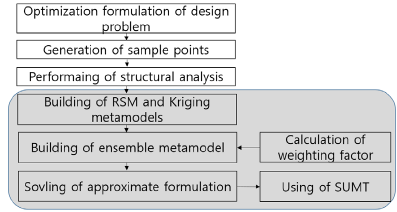 여기서 식 (9)의 다중목적함수를 위한 w R , w k 는 각각 반 응표면모델과 크리깅모델의 가중치이다. 또한 GMSE R 과 GMSE K 는 반응표면모델과 크리깅모델에 대한 식 (11)의 GMSE이다. 3.3 혼합메타모델을 이용한 최적설계과정 제안 본 연구에서는 구조최적설계를 위한 설계과정을 Fig. 2와 같이 제안한다.