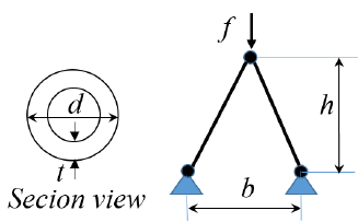 [Fig. 3] Two-bar design problem Minimize V Subject to S ≤ S max S ≤ S crit 20 mm ≤ d ≤ 80 mm , 200 mm ≤ H ≤ 1000 mm , t = 2 . 5 mm V = 2 π dt b 2 + h 2 , S = f 2 b π 2 dth + h 2 , S crit = 8 ( π b 2 2 Ed + h 2 2 ) , (13) 여기서 V는 체적, S는 수직응력, S crit 는 임계좌굴응력을 표시하며 S max =400MPa이다. 먼저 표본점을 라틴하이퍼큐브 방법으로 생성한 다음, 구조설계를 위한 반응치 V, S, S crit 를 Table 1과 같이 구 하였다. 본 예제의 결과 검토를 위해 500개의 시험 점을