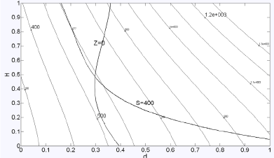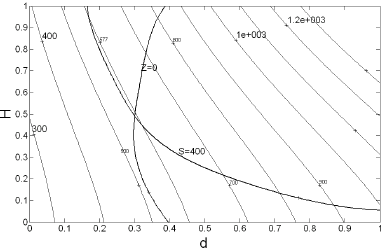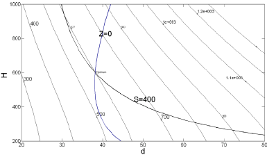 설정하였고 이에 대한 평균제곱오차 MSE를 계산하였 다. 먼저 각 반응치 V, S, S crit 의 반응표면모델과 크리깅 모델을 각각 생성하였으며 이를 Table 2에 표시하였다. 식 (5) 및 식 (7)에 포함된 반응표면모델과 크리깅모델의 파라미터 값을 Table 2에 정리한 것이다. 표본점 m=20일 때, RMSE 값을 보면 반응표면모델이 반응치 V에 대해 우수하고, 크리깅모델이 S, S crit 에 대해 우수한 결과를 보 이고 있다. 반면에 m=30일 때는 모든 반응치에 대해 크 리깅 모델이 우수함을 보이고 있다. [Table 3] Weighting factor and RMSE of ensemble model Cluster:3 Ccluster:6 Cluster:9 Res. RSM KRIG RSM KRIG RSM KRIG (W R ) (W K ) (W R ) (W K ) (W R ) (W K ) V 0.282 0.718 0.304 0.696 0.365 0.635 S 0.424 0.576 0.522 0.478 0.706 0.294 S crit 0.478 0.522 0.383 0.617 0.241 0.759 V: 0.7 V: 0.8 V: 0.6 RM S: 17.3 S: 17.2 S: 21.7 SE S crit : 2.9 S crit : 2.1 S crit : 2.1 클러스터의 개수를 각각 3개, 6개, 9개로 설정하였을 때 혼합메탈모델을 위한 가중치의 값을 Table 3에 정리 하였다. 클러스터 개수를 6개로 설정하였을 때 가장 신뢰 도 있는 혼합메타모델이 생성이 되었다. 또한 Table 2의 반응표면과 크리깅의 단일메타모델의 RMSE와 비교 시, Table 3의 모든 혼합메타모델의 신뢰도가 높게 평가되고 있다. 반면에 m=20개와 클러스터 6개로 구해진 혼합메타 모델과 m=30개로 구해진 단일메타모델을 비교하면, 단 일 반응메타모델보다는 우수하지만 단일 크리깅 메타모 델보다는 열세임을 알 수 있다. 식 (13)의 초기 최적화문제를 Fig. 4(a)에 도식적으로 표시하였다. 여기서 변수 Z=S/S crit 를 의미한다. 곡선 S와 Z의 교차점이 최적해이며 그 값은 d=38.20mm, h=600.3mm이 고, 그 때의 반응치는 각각 V=576.5mm 3 , S=400.0MPa, S crit =400MPa이다. 다음의 Fig. 4(b), (c)는 각각 반응표 면모델과 크리깅으로 근사화시킨 최적화 문제이다. Fig. 4(d)는 본 연구에서 제안한 혼합메타모델로 근사화시킨 최적화문제이다. 표본점의 개수 m=30일 경우, Table 2에 표시한 것과 같이 크리깅모델의 신뢰도가 높이 평가되고 있다. 이럴 경우 식 (9)로 정의되는 혼합메탈모델의 RMSE가 단일