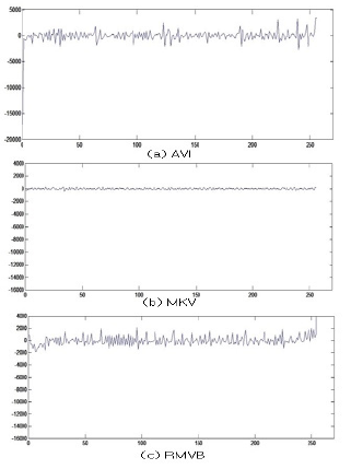 2.2 미디어 특징 추출 사용된 파일은 이진 데이터 형식을 취하고 있다. 본 연 구에서는 파일 데이터를 Fig. 1과 같이 아스키 코드 형식 으로 추출하였으며, 추출된 데이터는 히스토그램의 차분 을 통한 특징을 추출하는데 사용하였다. Fig. 1은 비디오 데이터로부터 추출한 아스키 코드의 일례이다. 각각의 비디오 형식의 분류를 위하여 BitTorrent 상에 서 가장 많이 사용되고 유통되는 비디오 형식인 AVI, MKV, RMVB 비디오 형식이 적용되었다. Fig. 2는 각 비 디오 파일 형식에 따라 추출한 특징 벡터들을 나타내고 있다. 동일한 비디오 콘텐츠에 대하여 구분 가능한 특징 을 나타내고 있는 것을 알 수 있다.
