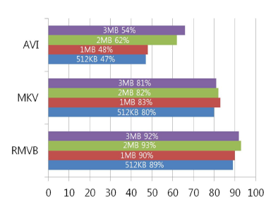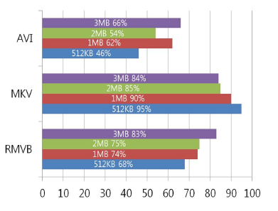[Table 3] Polynomial kernel used in classification rate 3MB avg 2MB avg 93% 89% 95% 96% 90% 91% 89% 95% RMVB 90% 90% 92% 90% 94% 93% 93% 93% 93% 96% 95% 93% 90% 87% 71% 50% 60% 64% 65% 60% 61% 55% AVI 36% 41% 54% 61% 65% 62% 48% 49% 54% 58% 69% 49% 68% 70% 85% 63% 90% 90% 80% 85% 73% 83% MKV 90% 85% 81% 93% 93% 82% 85% 80% 73% 71% 83% 78% 83% 71% 1MB avg 512KB avg 89% 91% 89% 88% 93% 90% 87% 89% RMVB 91% 93% 90% 91% 93% 89% 87% 84% 87% 90% 89% 94% 87% 88% 51% 34% 48% 24% 63% 6% 50% 64% AVI 64% 56% 48% 46% 63% 47% 69% 45% 59% 54% 80% 10% 56% 5% 95% 80% 88% 63% 82% 88% 85% 95% MKV 85% 80% 83% 85% 80% 80% 76% 88% 83% 76% 85% 70% 68% 73% Polynomial kernel 함수를 사용했을 때는 linear kernel 함수를 사용했을 때와 마찬가지로 AVI의 분류율은 약간 떨어지는 반면에 RMVB와 AVI의 경우에는 높은 분류율 을 보이고 있다. Fig. 3과 Fig. 4는 각각의 파일의 커널별, 파일 길이 별 분류율의 평균을 도수분포표로 나타낸 것이다.