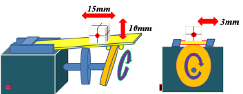 록 개발하였고, 3차원 방향으로 모두 움직이도록 개선하 여, 실제 사람의 호흡에 의한 종양의 움직임과 흡사하도 록 재현하였다. 구동은 3차원의 세 방향, 즉 상하방향 (superior-inferior, SI), 전후방향(anterior-posterior, AP), 좌우방향 (right-left, RL)방향으로 동시에 움직이도록 하 였으며, 이를 위하여 경사판 캠을 이용한 방법을 적용하 였다. 이동 거리는 SI 방향으로 15mm, AP방향 10mm,