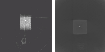 상태에서 영상을 획득한다. 즉, 특정 호흡 순간의 영상을 얻지 못한다. 따라서 본 연구에서는 RPM을 이용한 gating 기술을 적용하며 OBI와 EPID를 이용해 각각의 back projection 영상을 획득 하였다[Fig. 5]. 조사면은 10×10cm, gantry는 0 ~ 180°까지 1°간격으로 회전하면 서 back projection 영상을 획득하였다. 이렇게 획득한 back projection 영상들을 Matlab(MathWorks, US)을 이 용하여 filtered back projection 알고리즘으로 각각의 CBCT영상으로 단면영상을 재구성하였다.