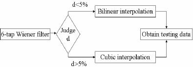 adjoining to point with gray-value equal to f ( x ) . From the equation (11), we can find that weight coefficient and the selection for the numbers of adjacent points are crucial to the precision of gradient d . Under H.264, during the procedure of searching for motion, the first interpolated value f ( x ) can be obtained through a 6-tap wiener filter. Taking computation complexity into consideration, we only take two integer pixels that are most close to f ( x ) . Take Fig.1 as an example, for point h we take the integer point G and M while for point b, G and H in horizontal direction will be picked up which is most closed in vertical direction, and C k is replaced by 1/2 here. When d< 5 %, the gray-value of F ( x ) does not change greatly, to which human’s eyes does not react sensitively enough. Approximately, assume the half-pixel found by motion search changes little compared with the adjacent gray-values. In practical, there is no much difference in result, whatever any algorithm adopted in second interpolation. The structure described details as following: Consequently, after the first interpolation of a block finishing finding the best matching pixels, if the gray-values of the pixels are consist to that of the neighborhood region, choosing bilinear algorithm for next interpolation; or else cubic method would be better. In this way, the results costs less time for computation without loss of interpolated quality in the meantime.[Fig. 2] Proposed algorithm