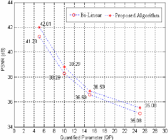 [Fig. 3] Comparison of PSNR between Bi-linear and Proposed AlgorithmFrom the data shown in the Fig.3,with the increase of quantified parameters, the number of zero-block increases accordingly, hence, PSNR will decrease in a certain extent. While the quantified parameter of "Miss America image" sequence is 5, the PSNR obtained from a simple bi-linear interpolation will be raised to around 0.8 dB. As the quantified parameters increase, PSNR from both algorithm declines largely. However, the PSNR got from the algorithm proposed in this paper is obviously 0.2~0.6 dB higher than regular algorithm