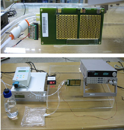 가능하고 연료교체가 편리하여 이동형 전원으로 많이 개 발되고 있다. 본 연구에서는 휴대용 기기의 전원 구동을 목적으로 외부 온도조절 장치, 가습장치가 없는 상온 상태에서 연 료전지의 한 종류인 직접 메탄올 연료전지의 평가시스템 을 구성하여 상온 상태에서 연료의 농도, 공급 유량에 따 른 출력 특성을 알아보았다. 실험결과를 요약 하면 다음 과 같다.