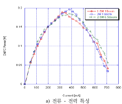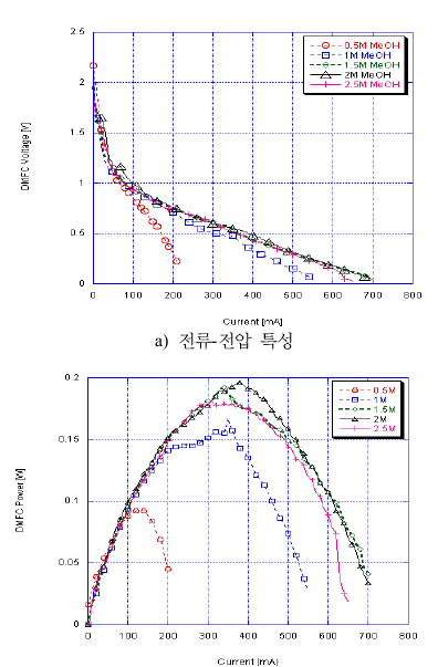 b) 전류-전력 특성 [그림 5] 메탄올 농도에 따른 특성 (0.5M - 2.5M)