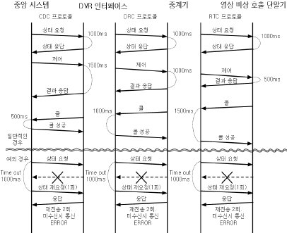 인 CDC(Central System DVR interface Communication, 이하 CDC), DVR 인터페이스와 중계 장치 간의 통신 프 로토콜인 DRC(DVR interface Repeater Communication, 이하 DRC), 중계 장치와 영상 호출 단말기 간의 통신 프 로토콜인 RTC(Repeater Terminal Communication, 이하 RTC) 프로토콜로 구성된다. 제어의 경우 중앙 시스템은 DVR 인터페이스에게, DVR 인터페이스는 중계 장치에 게, 다시 중계 장치는 영상 호출 단말기에게 제어 명령을 전송하고 영상 호출 단말기는 상태 및 제어 결과를 전송 한다. 그림 2는 다채널 저가형 통합 감시 호출 시스템의 제어 절차이다.