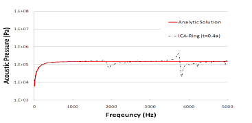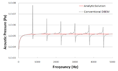 직접경계요소법의 비유일성을 회피하기 위해 일반적 으로 적용되고 있는 CHIEF 방법과 최근 새롭게 제안된 ICA-Ring 방법의 특성과 성능을 고찰하고자 법선방향 균 일속도(1 )로 진동하는 구의 음향방사문제에 대한 수치해석을 수행하였다. 그림 3은 수치해석모델을 보인 것으로 반지름 는 1m이며, 384개의 4-절점 선형요소 모 델링하였다. 이 때, 수신기의 위치는 모델 중심으로부터 10m 떨어져 있으며, 음향공간의 유체밀도는 1000 , 음속은 1500 , 해석 주파수는 10Hz에서 5000Hz까지 10Hz 간격이다. 그림 4는 기존 직접경계소요법을 이용한 수치해석결 과(conventional DBEM)를 해석해(analytic solution)[4]와 함께 도시한 것으로 특정 주파수에서 규칙적으로 해의 비유일성이 나타나고 있다.