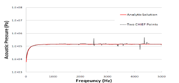 [그림 4] 기존 직접경계소요법을 이용한 수치해석결과와 해석해 비교 [표 1] CHIEF POINT 수에 따른 주파수구간별 오차 Freq. Range(Hz) CHIEF Point Number from to 0 1 2 3 10 1000 504.9% 1.8% 1.6% 1.8% 1010 2000 34.4% 3.2% 3.0% 4.8% 2010 3000 42.1% 6.3% 3.5% 6.7% 3010 4000 29.9% 5.5% 3.3% 8.5% 4010 5000 20.9% 12.9% 3.8% 10.5% 그림 5는 CHIEF 방법에 의한 비유일성 회피 결과를 해석해와 함께 보인 것이며 표 1은 주파수 구간별 오차율 을 식 (11)에 따라 정리한 것이며, CHIEF 점 1개 추가 하였을 때 해의 비유일성이 완화되어 오차가 상당한 수 준으로 줄어들었으나 CHIEF 점의 수를 증가에 따른 효 과가 그리 크지 않음을 알 수 있다.