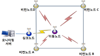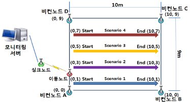 실험환경은 싱크노드 1개, 이동노드 1개, 비컨노드 4