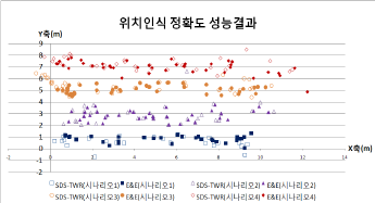 [그림 5] 위치인식 정확도 성능결과 SDS-TWR과 E&E의 위치인식 정확도 성능을 비교한 결과는 표 3과 같다. [표 3] 위치인식 정확도 성능 비교 ( 단위 : m) S1 (1m) S2 (3m) S3 (5m) S4 (7m) TWR SDS E&E TWR SDS E&E TWR SDS E&E TWR SDS E&E 위치 인식 오차 0.41 0.28 0.54 0.39 0.52 0.29 0.93 0.39 평균 먼저, 시나리오 1~4(S1~S4)에서 측정된 SDS-TWR 위 치인식 오차 평균은 0.6m이다. 그리고 E&E를 적용한 결 과, 약 0.26m정도 위치인식 성능이 향상되었다. 시나리오 1~4에 대한 세부 내용은 다음과 같다. 시나리오 1에서 SDS-TWR은 위치인식 오차 평균이