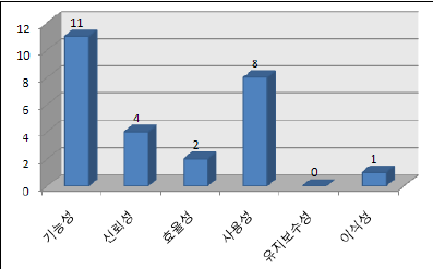 사용자가 수행한 가장 최근의 해당 사항 없 [표 14] 신뢰성 확보를 위한 u-Health S/W 품질평가 10 작업이 사용자의 취소될 작업이 수 심각한 있는가 ? 결과 N/A 음 품질 특성 부특성 메트릭 측정값 를 초래하고 취소될 수 없는 경 결함 회피율 0.92 11 우 그 작업이 수행되기 전에 경 NA 결함 탐지율 0.87 고 또는 확인 메시지가 제공되 는가 ? 성숙성 문제해결 정보제공 Y 시스템 또는 데이터에 손실을 결함발생 평균시간 0.95 12 주지 연하거나 않고 취소할 진행 중인 수 있는 작업을 기능 지 NA 문제 해결률 0.92 이 제공되는가 ? 다운 회피율 0.95 사용자가 정의한 작업 순서를 결함 허용성 장애 회피율 0.87 13 한 한 따르지 옵션과 정보를 않을 그런 제공하는가 때 옵션을 시스템은 ? 얻기 유용 위 N/A 어떤 해당 음 사항 화면에 없 신 뢰 성 데이터 데이터 오조작 복구율 회복 회피율 정보제공 0.92 Y 1.00 사용자가 가능한 원하지 않는 서든 Home 이용 가능률 0.95 14 상황에서 쉽게 나오기 위한 수 Y 페이지로 되 회복성 평균 복구 시간 0.87 단을 제공하는가 ? 돌아 갈 수 있음 복구 가능률 1.00 Y 의 개수 4 복구 효과율 0.92 N 의 개수 0 장애 회피율 0.95 결 과 1.00 신뢰성 표준 준수율 0.92 준수성 신뢰성 수준 정보 제공 Y [표 13] 오조작 회피 점검표 순번 오조작 기능 회피 상세 설명 여부 회피 비고 실험결과 표 14와 같이 신뢰성의 관점에서 전반적으 로 우수한 결과를 보이고 있는 것으로 나타난다. 모든 입력이 콤보 박스에서 선 그 외 다른 품질특성의 결과는 표 15같이 나타났다. 1 " 없음 이 오조작의 되는 “ 기능이 대상 레디오 크박스를 택하거나 어 있어 버튼을 오조작의 체크하는 버튼을 클릭하거나 가능성이 클릭하거나 형태로 체 없 되 1 [표 15] 다른 품질특성의 품질 평가 음 특성 품질 부특성 메트릭 측정값 Y 의 개수 1 적합성 기능 구현 완전성 0.96 N 의 개수 0 기능성 정확성 진단 정확성 0.92 결 과 1.00 보안성 변경 방지 Y 사용자 친화적 메뉴얼 0.95 이해 가능성 4.3 시험 결과 사용성 사용자 안내성 Y 본 시험사례의 품질 평가결과는 표 14와 같다. 선정은 가능성 학습 기능 학습 용이성 0.87 평가 대상 소프트웨어의 특성을 고려하여 중요성이 낮거 시간 효율성 실시간 전송 0.96 나 평가 대상이 준비되어 있지 않거나 적용하기에 적합 자원 효율성 저전력 0.96 효율성 하지 않은 것들은 제외될 수 있다. 회복성 QoS Y 메트릭 결과에 대해 메트릭 측정값의 범위에 따라 매 준수성 신뢰성 수준 정보 제공 0.92 우미흡(0.6미만), 미흡(0.6이상-0.7미만), 보통(0.7이상-0.8 미만, 우수(0.8이상-0.9미만), 매우우수(0.9이상) 등으로 대상 제품에 대한 시험결과 품질 특성별 결함내역은 레벨을 분류할 수 있으나 축적된 평가결과를 분석하는 다음 그림 5와 같다. 기능성 결함수는 11개, 신뢰성 결함 연구를 통해 타당성이 검증될 필요가 있다. 수는 4개가 나타났다. 그리고 사용성 결함수는 8개, 이 식성 결함수는 1개 효율성의 결함수는 2개 유지보수성의 결함수는 나타 나지 않았다. 시험결과 본 논문에서 제 안한 u-Health S/W 품질평가 모델은 u-Health S/W의 기