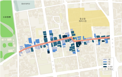 부산이나 양산, 창원에서 온 외국인 방문객이 많은 것도 다수의 외국인근로자 밀집지역에는 중국인 점포가 많은 것에 비해 대상 지역은 베트남, 인도네시아, 필리핀, 몽골 등 다양한 국가출신의 상인들이 운영하는 식료품, 잡화점 이 많이 입점하고 하고 있기 때문이다[1]. [Table 1] The 1st floor use of the around buildings [1] Use Numbers of the stores (%) Food and beverage 39 (26.3) Apparel 31 (20.9) Dwelling 14 (9.4) Beauty· Cosmetics 13 (8.8) Amusement 9 (6.1) Cellular phone · electronics 8 (5.4) Educational facilities 6 (4.1) Clinic 6 (4.1) Parking lot 4 (2.7) Etc. 18 (12) Total 148 (100.0)