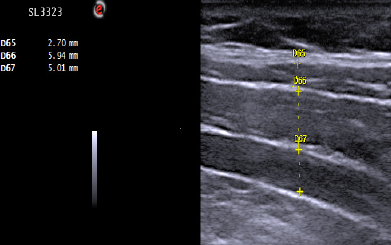 [Fig. 1] Ultrasonography-thickness of abdominalis (D65:external oblique abdominalis, D66:internal oblique abdominalis, D67:transvers abdominalis)