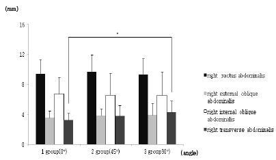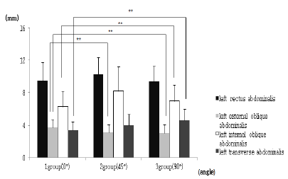 [Fig. 2] Changes according to the angle of the left abdominal muscle thickness change **p<0.01 Values are mean ± SD[Fig. 3] Changes according to the angle of the right abdominal muscle thickness change *p<0.05 Values are mean ± SD