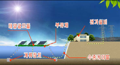 개발되고 있는데, 그 중에 최근 국내외적으로 각광을 받 고 있는 수상태양광(Floating Photovoltaic) 기술도 태양 광발전의 하나의 응용기술이라 할 수 있다. 수상태양광 발전은 기존의 육상태양광 발전기술과 수상부유 (floating) 기술을 융합한 새로운 개념의 태양광발전 시스 템이다. 수상태양광 발전시스템은 태양전지 모듈을 육상 이 아닌 수상에 설치한 것으로 Fig. 1과 같이 태양광 모 듈, 물위에 부상하여 태양광 모듈을 고정시키는 구조체 및 부유체, 부유체를 고정 시키고 수위변동에 대응하는 Accepted August 7, 2014