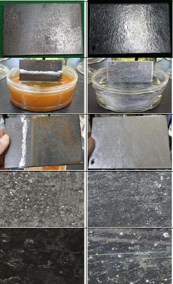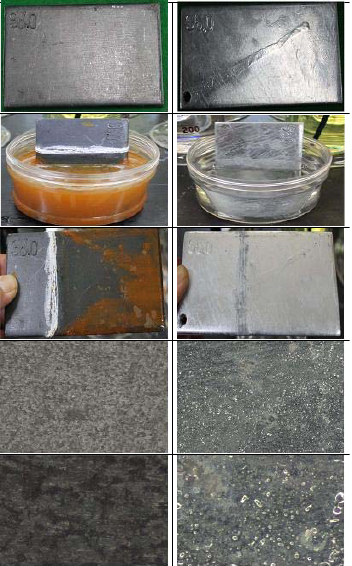 도금두께와 용액의 농도에 따른 부식실험에서는 Table 5 및 Fig. 5 와 같이 침적시간이 짧을수록, 용액농 도가 높을수록 부식이 심하게 발생하였다. 일반적 도금 두께는 크기와 형상에 따라 차이가 있으나 일반적으로 10분에 약 70μm 정도이다. [Table 5] Corrosion Test Result of Steel(3.5T Standard Sample Thickness) 3.5T standard sample[μm] Solution Concentration 15minute 20minute 30minute 1 wt% 10 12 14 2 wt% 8 9.8 12.1 3 wt% 4.7 9.3 12 4 wt% 2.8 6 8 5 wt% 2 4.2 6.8