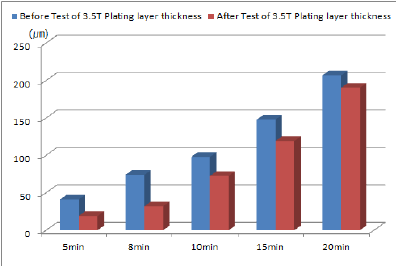 [Fig. 5] Change of Plating Layer at Various Concentrations 또한 5분, 8분, 10분, 15분, 20분을 표준시편과 동일한 두께인 3.5T 시편에 적용하여 1wt% 용액에 7일간 침척 후 피막두께 측정기를 이용하여 측정하였다. 그 결과 Table 6 및 Fig. 6과 같이 두께가 두꺼울수록 감소율이 작아서 부식 저항성이 높게 나타났다. [Table 6] Corrosion Test Result of Steel(3.5T Standard Sample Thickness) 3.5T Plating layer thickness[μm] Plating Time Before Test After Test Reduction Ratio(%) 5minute 41 19.1 53.4 8minute 74 32.1 56.6 10minute 98 72.5 26.0 15minute 148 119.4 19.3 20minute 207 190.3 8.1