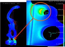 Fig. 4에 6061 알루미늄 합금(AA6061)으로 설계된 너클 모델의 해석결과를 나타내었다. 해석결과 중 취약 부위를 나타낼 수 있는 von-Mises stress를 확대하여 그림으로 나타내었는데 그림에 von-Mises stress 최대값을 나타내는 위치도 화살표로 표시하였다.