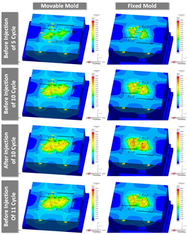 예열 계산이 끝나고 열 계산 공정에 따른 금형의 온도분포를 Fig. 11에 나타내었다. 첫 번째 열 계산 공정 5번째 사이클의 사출 직전 금형 온도에서 파란 영역은 온도가 40〫 C 이하이고, 빨간 영역은 온도가 65〫 C 이상인 영역이다. 코어와 캐비티 표면 온도가 45~59〫 C로 분포하며, 사이클이 진행되면서 제품 온도에 의해 금형 온도가 상승한다. 열 계산 공정 10번째 사이클의 사출 직전 금형 온도는 코어와 캐비티 표면 온도가 47~64〫 C로 분포한다. 열 계산 공정 10번째 사이클의 사출 직후 금형 온도는 코어와 캐비티 표면 온도가 48~67〫 C로 분포하며, 사출 직후에는 코어에서 열이 빠져나가지 못해서 80〫 C까지 온도가 상승한다. 열 계산 공정 11번째 사이클의 사출 직전 금형 온도는 코어와 캐비티 표면 온도가 48~63〫 C로 분포하며, 사출 직후에 코어에 갇힌 열이 빠져 나간 것을 확인할 수 있다. 또한 사출 직전 이동측