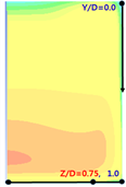 로 곡률반경에 따라 속도프로파일의 변화율은 다소 차이는 있지만 Y/D=0.1로부터 점증적으로 속도프로파일이 증가하며, 대체로 Y/D=0.8부근에서 최대치를 보이며 그 편차는 각각 다르다. 특히 Y/D=0.4이후에서는 곡률반경이 클수록 다소 편차가 크고, Y/D=0.4∼0.8영역에서는 대체로 곡률반경이 클수록 속도프로파일의 변화율이 더 커지는 특성을 보임을 알 수 있었다.