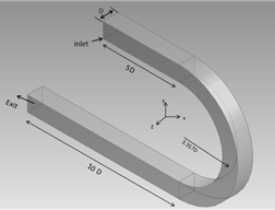 본 연구에서는 ANSYS v.16에서 제공하는 전처리 프로그램인 Design Modeler를 이용하여 정사각형 단면을 갖는 180° 곡관을 모델링하였으며, 해석모델의 기본 제원 및 형상은 각각 Table 1과 Fig. 1에 나타내었다. 먼저 Chang 등[14]가 수행한 실험결과와 동일한 조건에 대한 비교를 30D의 직관을 별도로 모델링한 후 입구속도 9.2 m/s에 대한 수치해석을 수행한 후 출구에서의 완전발달된 속도분포결과를 FLUENT가 제공하는 Profile기능을 이용하여 Fig. 1의 입구속도조건으로 사용하였다. Table 1에서 *의 의미는 곡관하류에서 민감도 분석시 직관거리 60D까지 모델링하여 해석하기 위한 것이다.