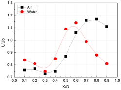 일하게 입구속도 9.2 m/s에서 서로 다른 작동유체인 물과 공기를 이용하여 곡관부에서 90°의 X축방향 및 180°의 Y축방향에서 얻어진 각각의 속도프로파일 및 유동장 특성을 나타낸 것이다. 그 결과로 Fig. 4(a)와 Fig. 5(a)에 나타난 바와 같이 곡관부의 90° 단면위치에서 공기의 경우는 X/D=0.3까지는 안쪽 벽면에 가까운 영역으로 곡관부를 지나면 바깥 벽면쪽의 속도가 치우쳐 나타남으로 인해 상대적으로 낮은 속도분포를 보이다가 그 이후에서는 속도가 증가하여 X/D=0.8부근에서 최고치를 나타내어 다시 감소함을 보이고 있다.